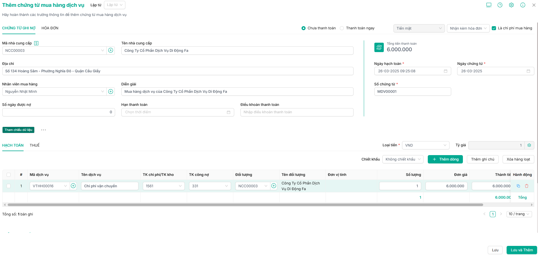 Bước 3: Người dùng khai báo các thông tin khác của chứng từ mua dịch vụ