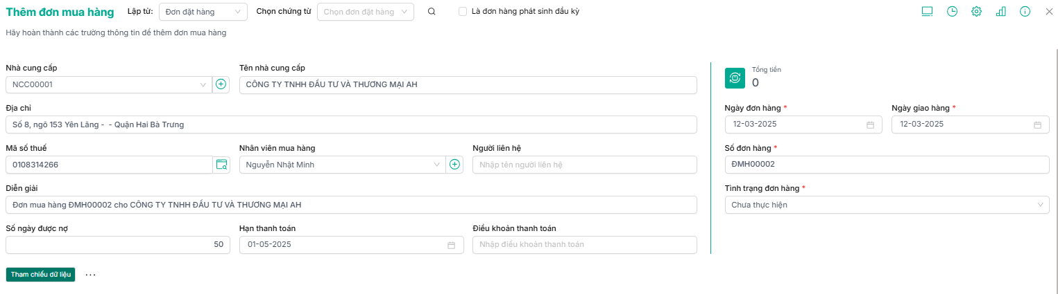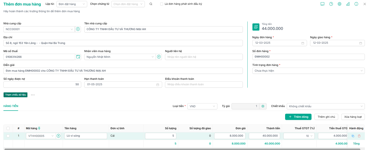 Bước 2: Người dùng tiến hành khai báo các thông tin về Đơn mua hàng