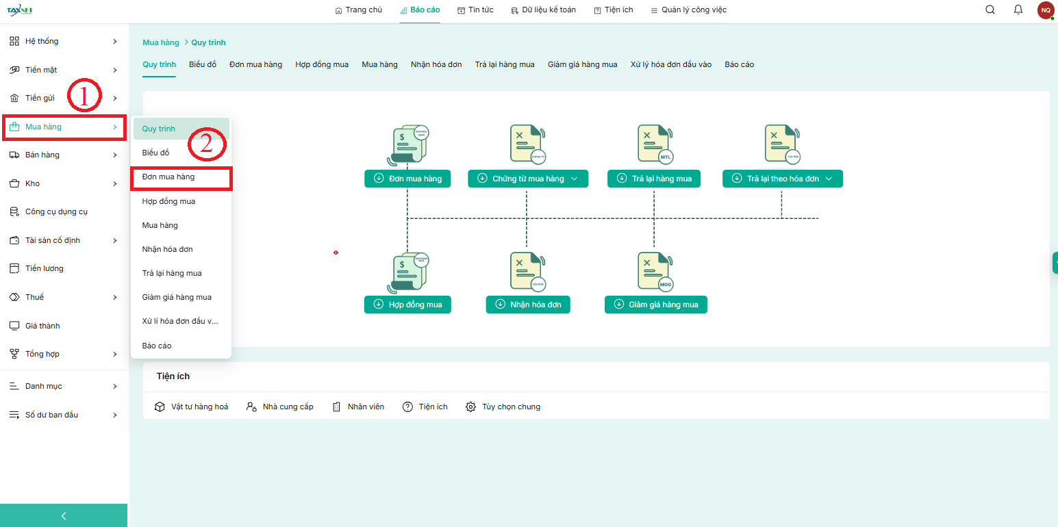 Bước 1: Vào phân hệ Mua hàng → Chọn Đơn mua hàng→ Chọn Thêm (Hoặc vào phân hệ Mua hàng →chọn Quy Trình→ chọn Đơn mua hàng)