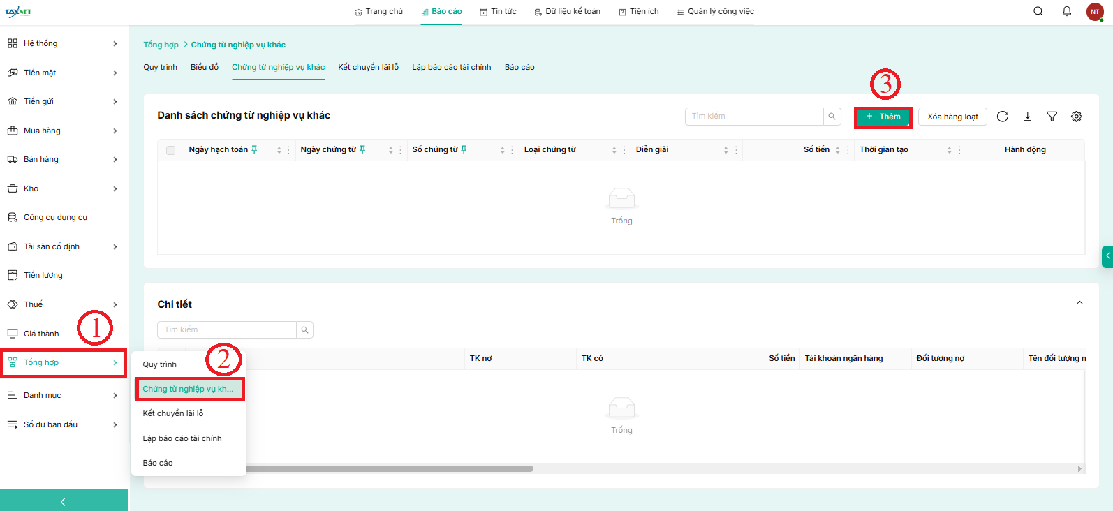 Bước 1: Chọn Tổng hợp → chọn Chứng từ nghiệp vụ khác → chọn Thêm