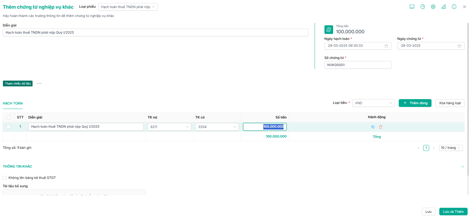 Bước 2: Ở loại phiếu người dùng chọn hạch toán thuế TNDN phải nộp