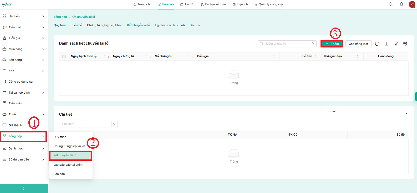 Bước 1: Vào Tổng hợp → chọn Kết chuyển lãi lỗ → Chọn Thêm