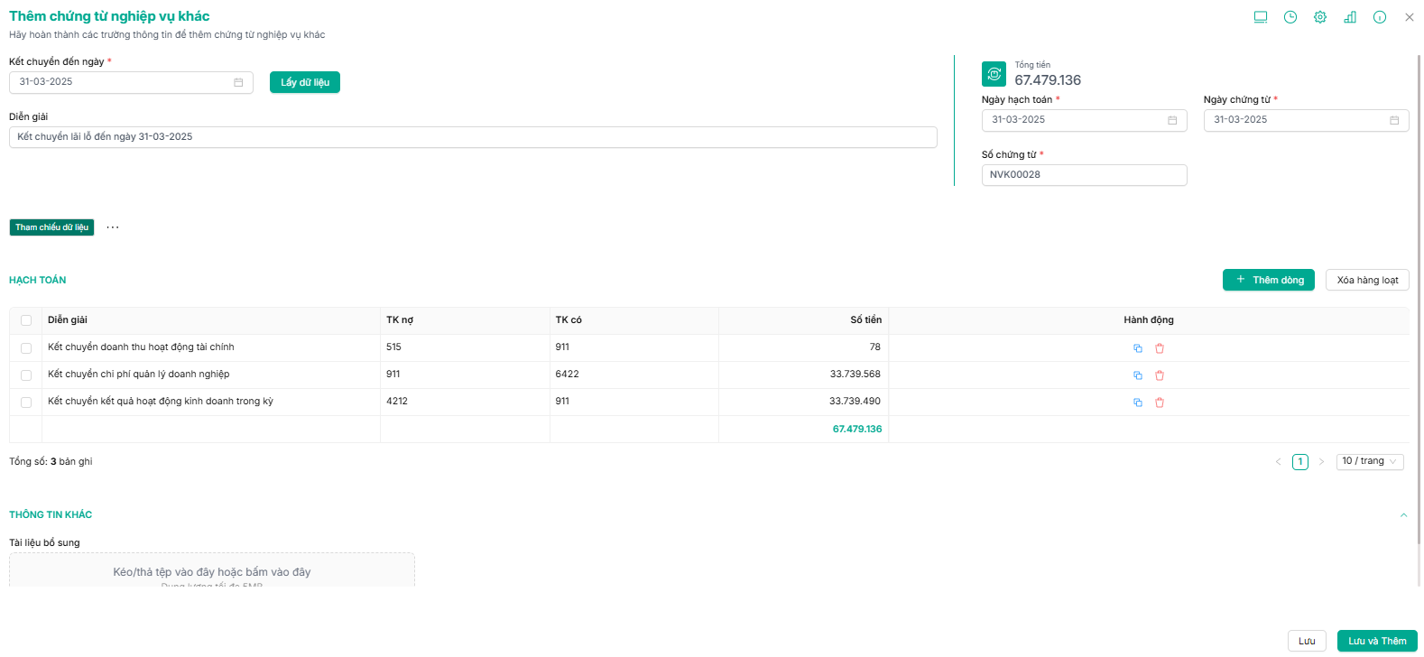 Kết chuyển lãi lỗ hỗ trợ người dùng lập chứng từ kết chuyển cuối kỳ để xác định kết quả hoạt động sản xuất kinh doanh như: kết chuyển doanh thu, kết chuyển chi phí.