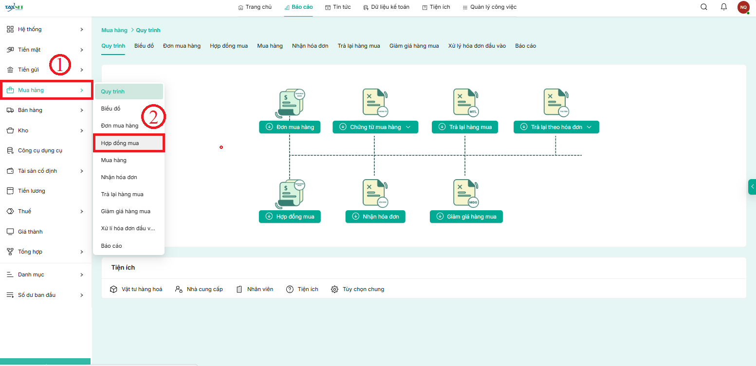 Bước 1: Vào phân hệ Mua hàng → chọn Hợp đồng mua → chọn Thêm (Hoặc chọn Mua hàng → Quy trình → chọn Hợp đồng mua)