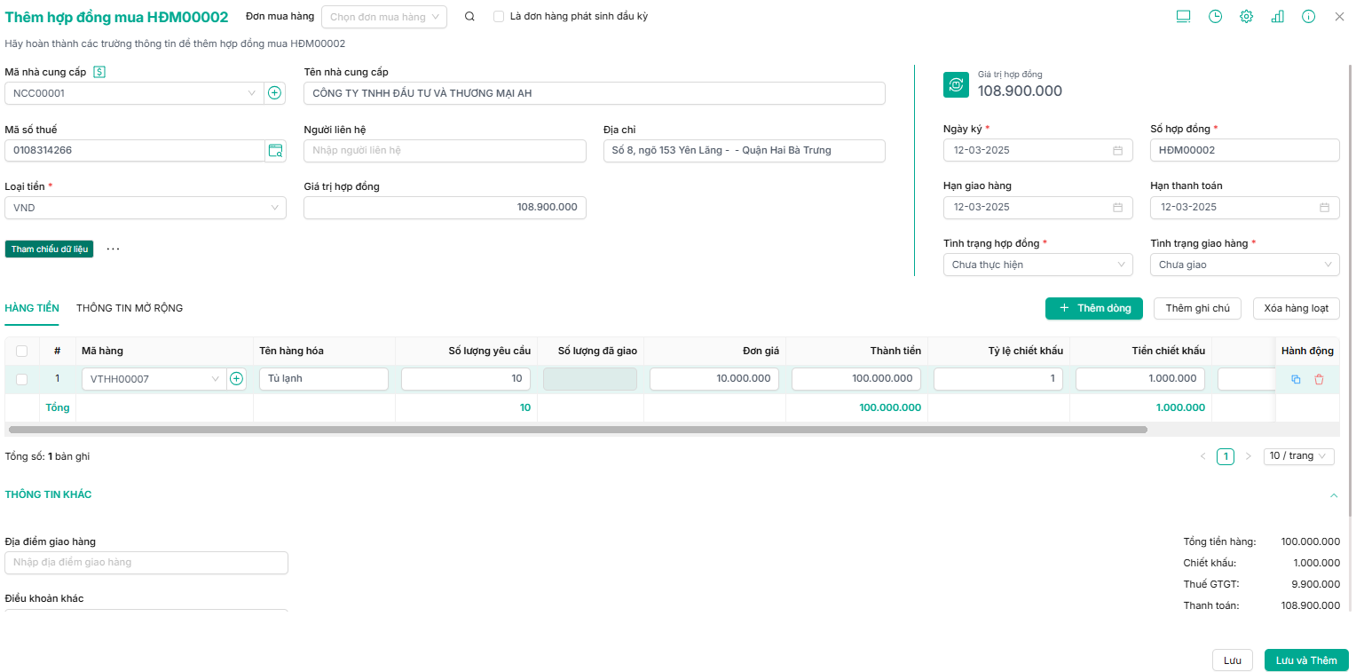 - Ngày ký, Hạn thanh toán, Hạn giao hàng, Số hợp đồng: Số hợp đồng sẽ được hệ thống tự động đánh tăng.