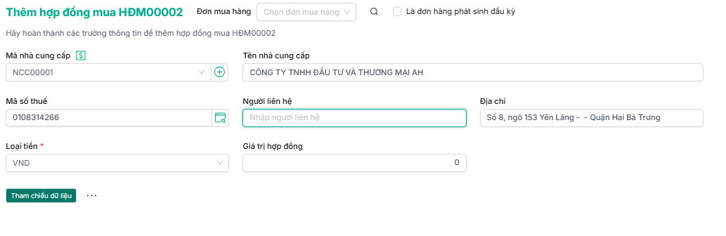 Bước 2: Khai báo thông tin về Hợp đồng mua: