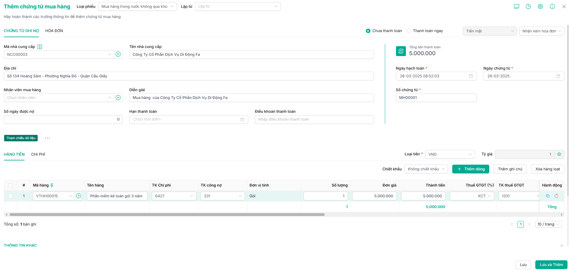 Bước 3: Người dùng tiến hành khai báo các thông tin của chứng từ mua hàng