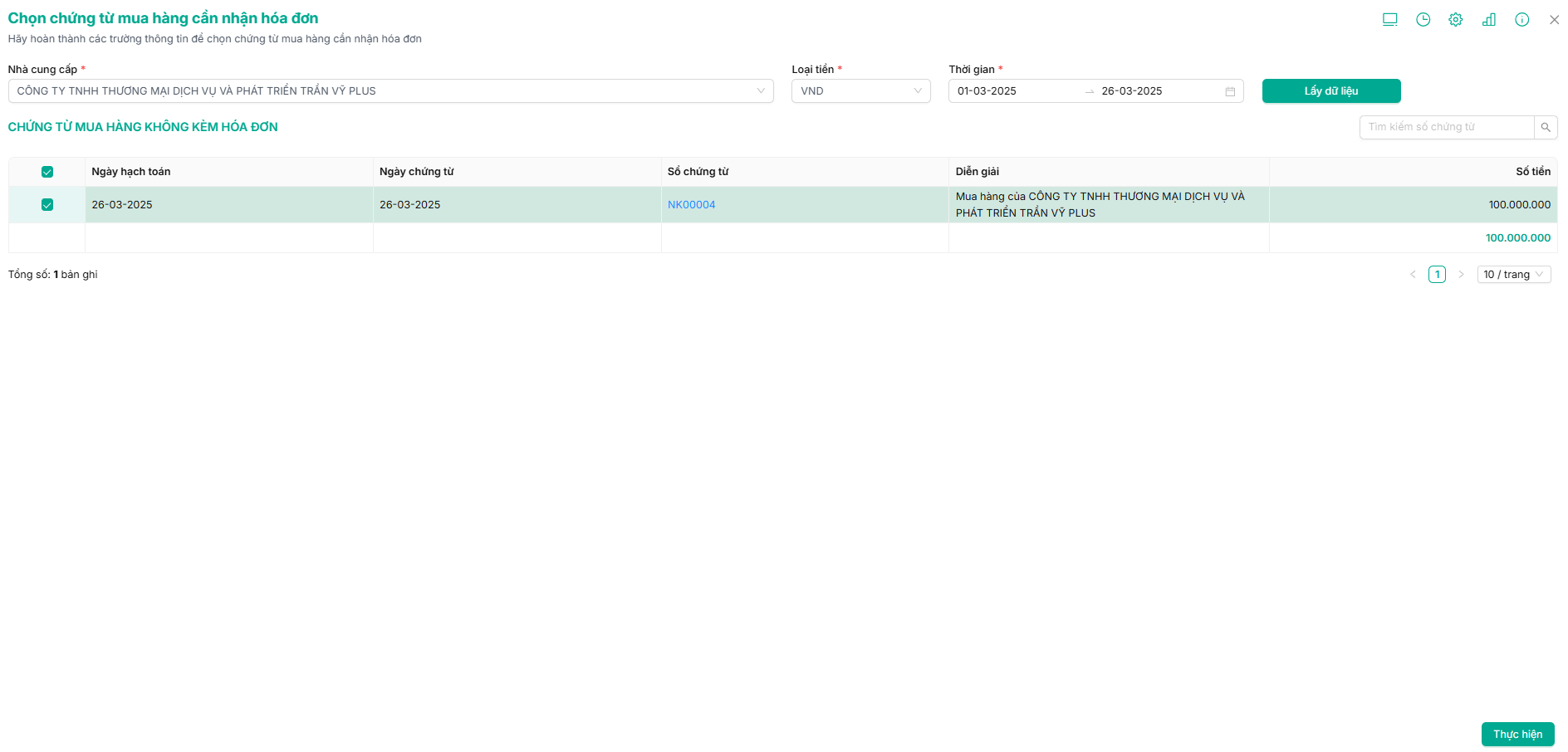 -Tích chọn chứng từ cần nhận hóa đơn và nhấn Thực hiện