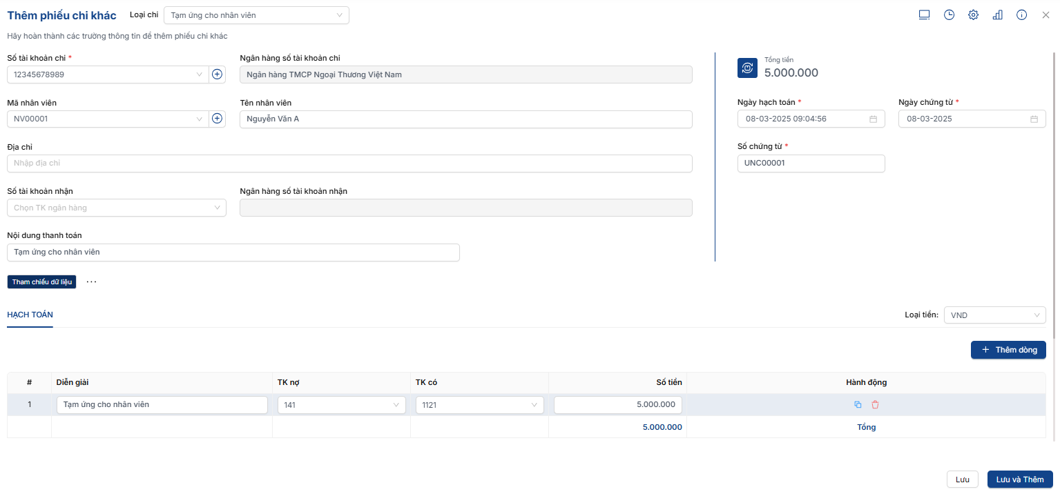 Nghiệp vụ Chi tạm ứng nhân viên bằng tài khoản ngân hàng được thực hiện trên phần mềm như sau: