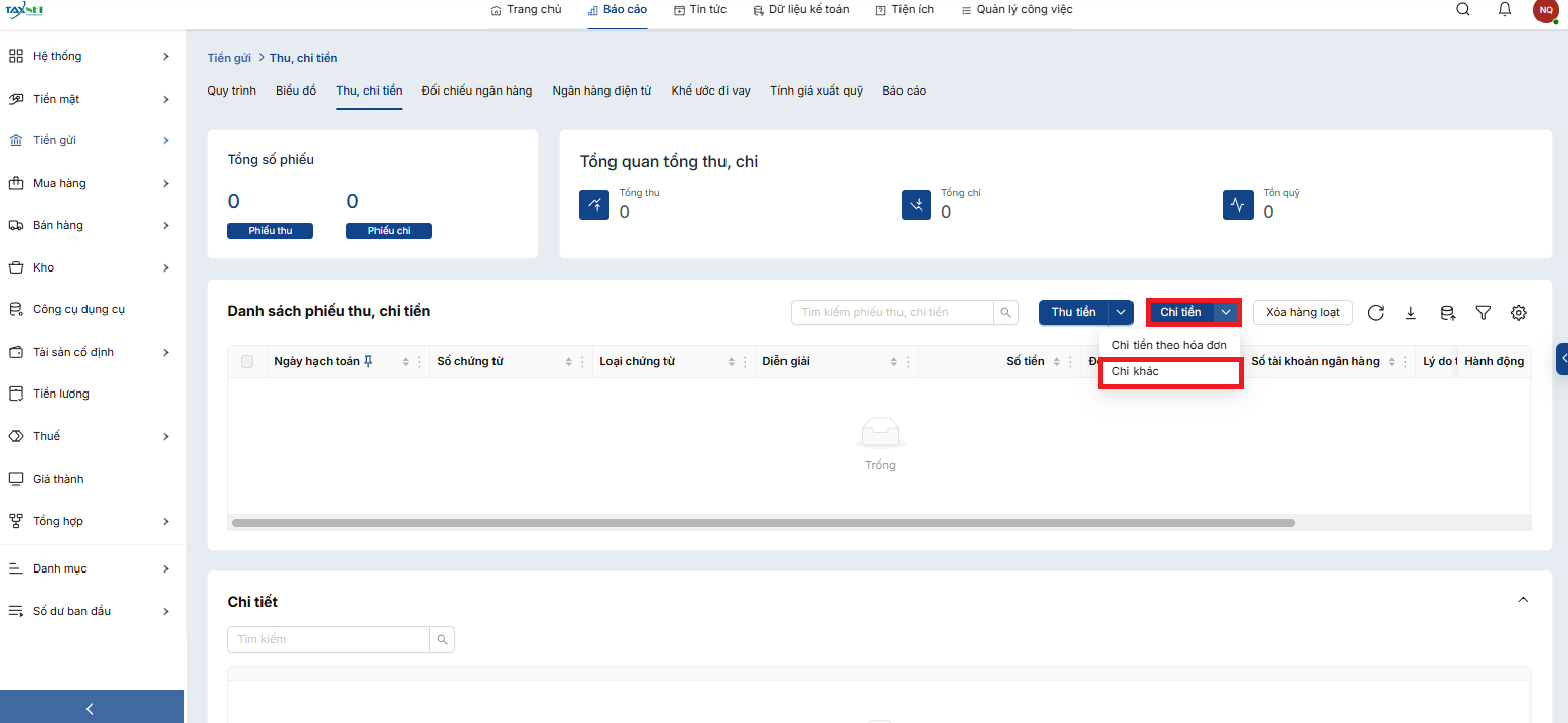 Bước 1: Vào phân hệ Tiền gửi → Thu, chi tiền