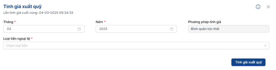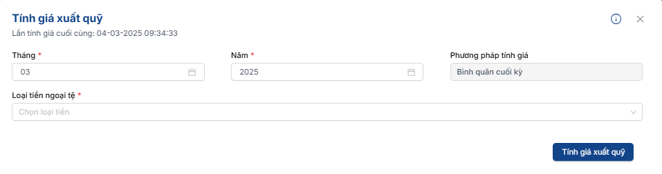 Bước 2: Chọn kỳ tính giá xuất quỹ, Loại tiền muốn tính giá xuất quỹ và bấm tính giá xuất quỹ. Phần mềm sẽ tự động cập nhập tỷ giá xuất quỹ của các chứng từ liên quan.