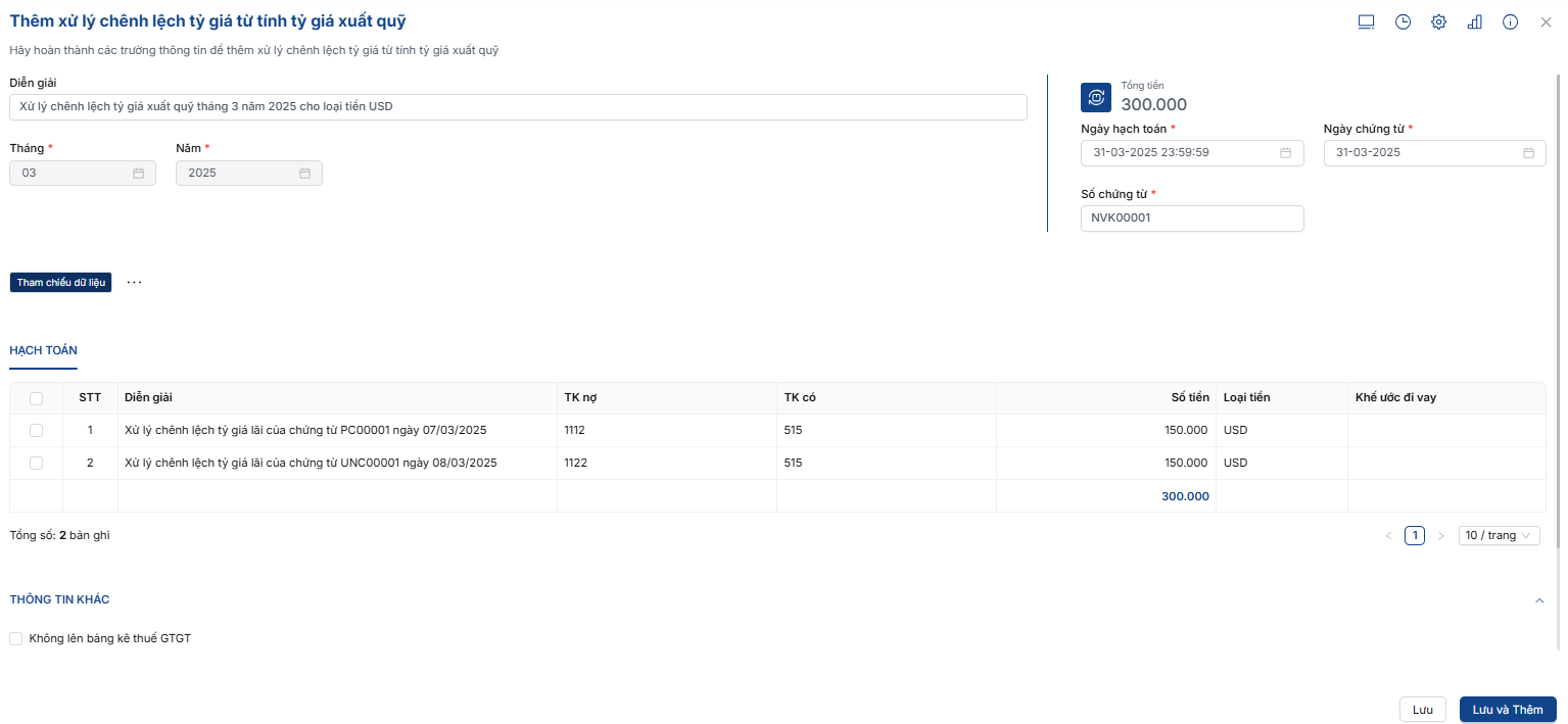 Bước 3: Phần mềm tự động sinh thêm chứng từ xử lý chênh lệch tỷ giá. Người dùng tiến hành kiểm tra sau đó nhấn Lưu.