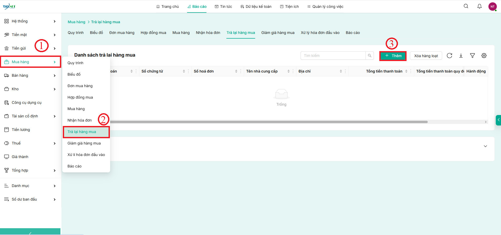 Bước 1: Chọn Mua hàng → chọn Trả lại hàng mua → chọn Thêm