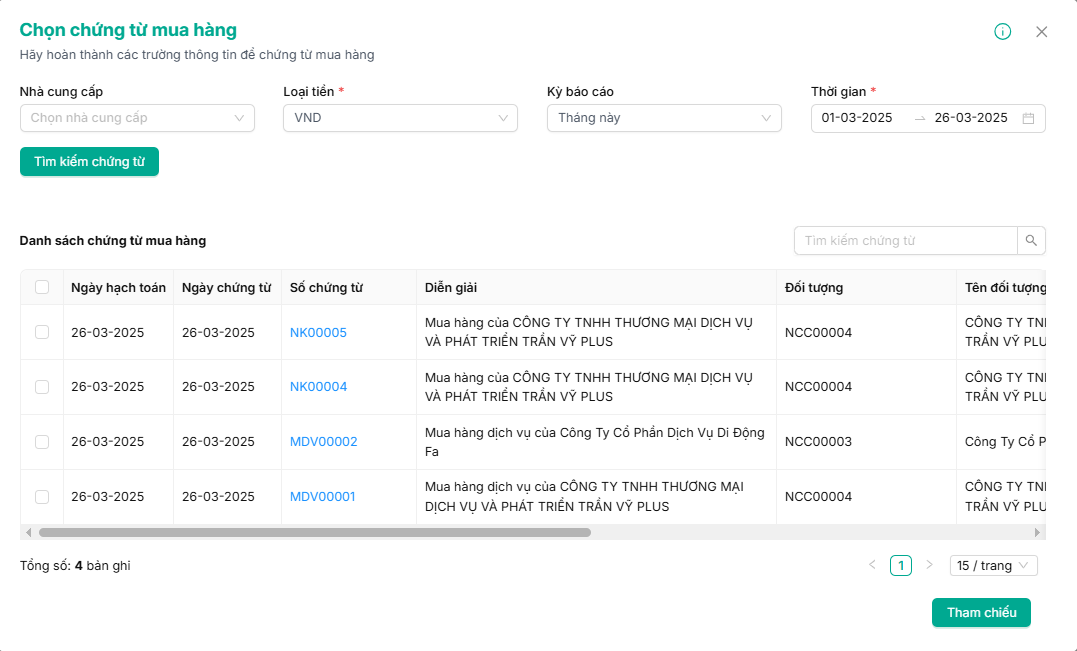 - Hoặc anh chị có thể nhấn vào nút kính lúp để thiết lập tìm kiếm chứng từ. Anh chị tiến hành tích chọn chứng từ và nhấn tham chiếu.